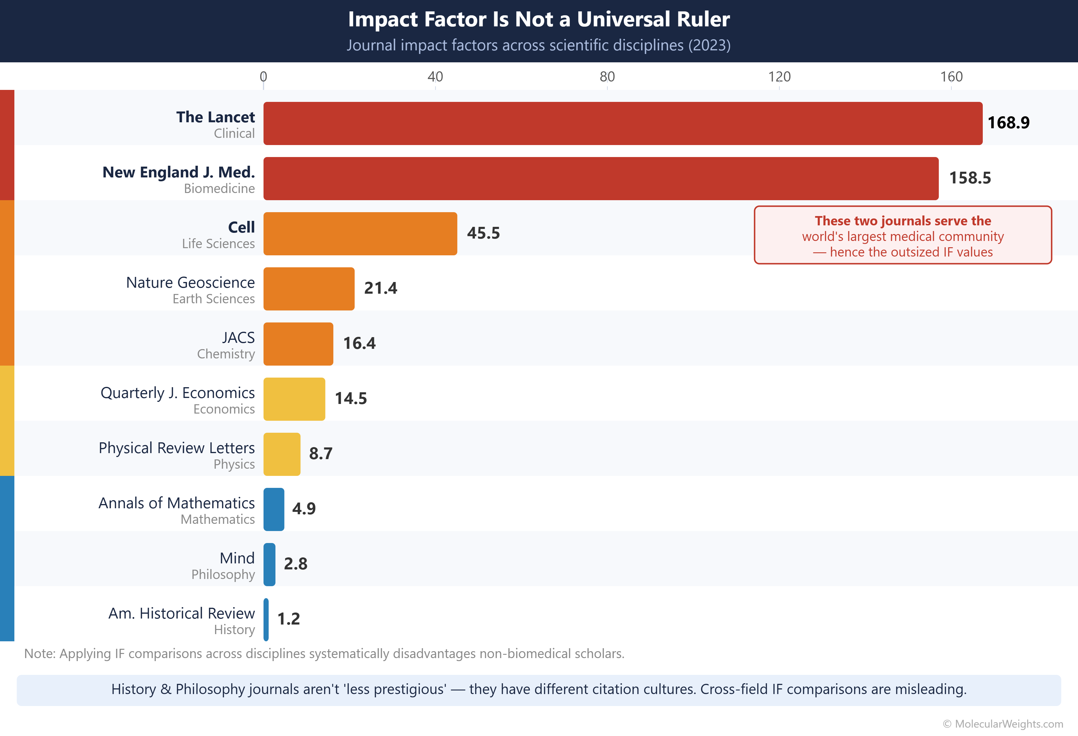 Humanities vs. sciences: This disparity is enormous. Nature’s IF of ~65 exists because biomedical papers generate rapid citations. A top philosophy journal might have an IF of 1–3, not because the work is less valuable, but because the citation culture and timescales differ completely. Applying IF comparisons across disciplines is methodologically indefensible, yet it happens constantly in hiring and promotion decisions.