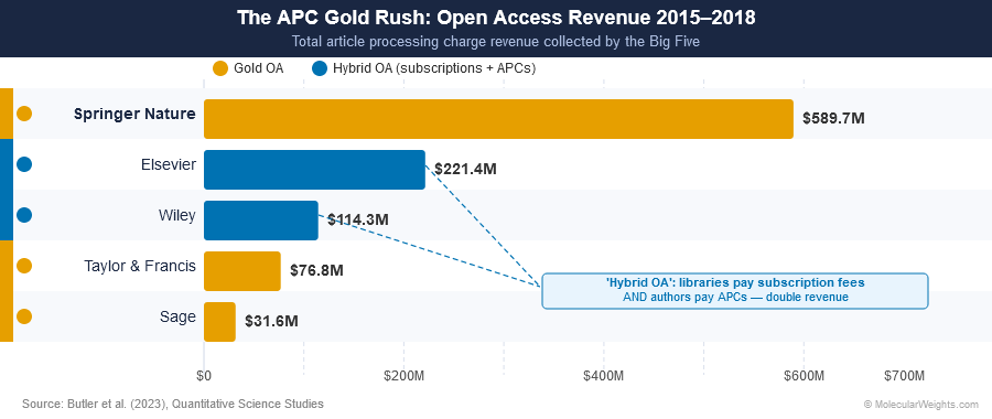 A 2023 study in Quantitative Science Studies by Leigh-Ann Butler and colleagues estimated that globally, authors paid $1.06 billion in article processing charges to the Big Five publishers between 2015 and 2018 alone. That was before APC prices began accelerating.4