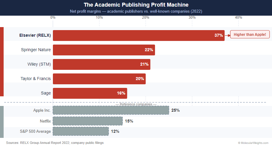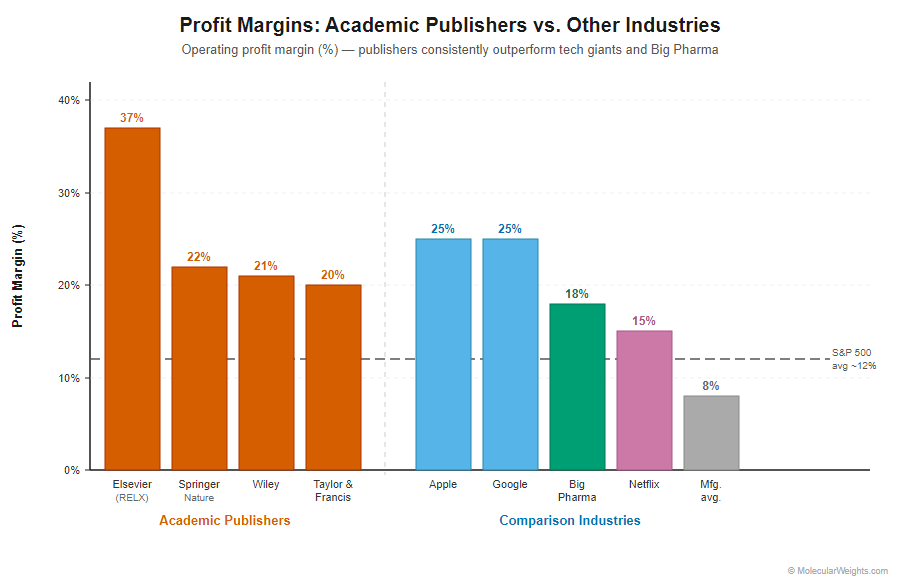 For context: the pharmaceutical industry, frequently cited as a high-margin sector, averages around 15–20% net margins. The average S&P 500 company earns about 12%. Elsevier’s 37% margin has been sustained for years, described in the company’s own annual reports and independently confirmed by multiple analyses.2,3