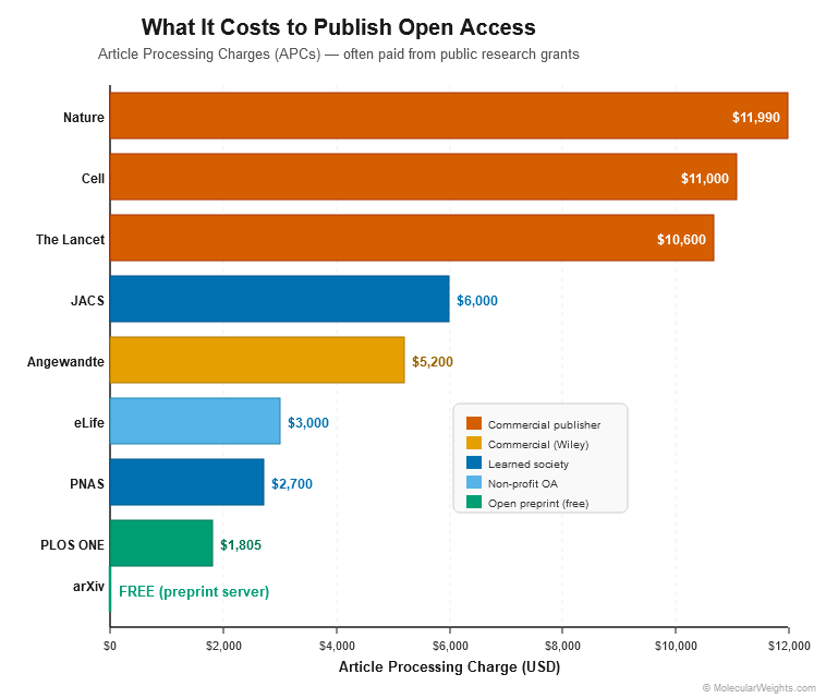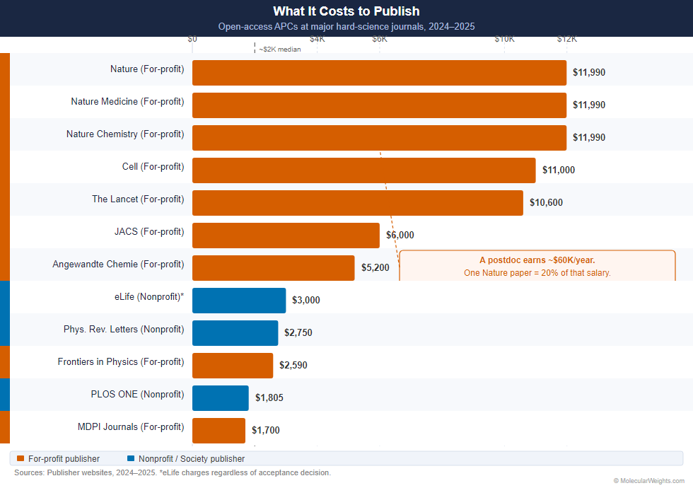 The Lancet’s APC of $10,600 to publish a single paper publicly carries a steep cost. A postdoctoral researcher’s annual salary at many US institutions is around $55,000–$65,000. Publishing one open-access paper in that journal costs roughly 15–20% of their annual salary, paid to the publisher rather than to the researcher.