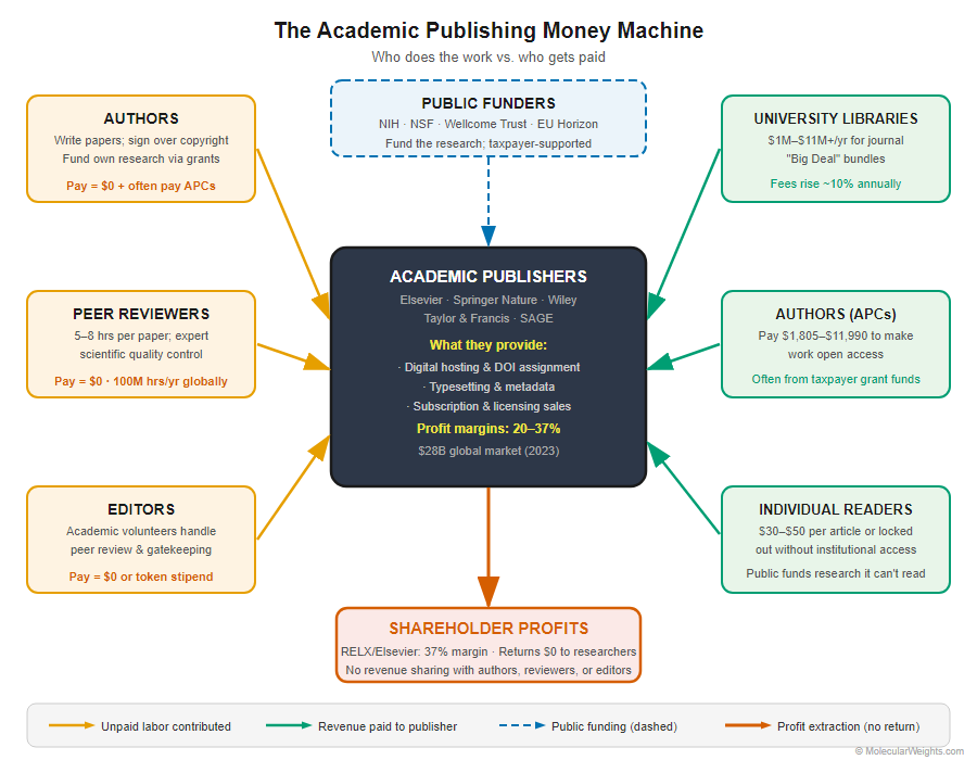 The researchers write the papers. Other researchers review them for free. Universities pay billions to read them. And the publishers, who created none of it, pocket margins that make Apple look modest.