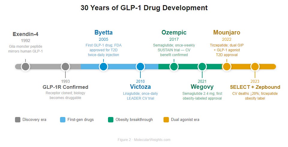 Figure 2. From Lizard Venom to Billion-Dollar Drug: 30 Years of GLP-1. Thirty-year arc from Gila monster venom to a global obesity drug class. Timeline is not to proportional scale. Colors denote development generation: gray = foundational pharmacology; blue = first-generation GLP-1 receptor agonists; green = semaglutide era; orange = dual GLP-1/GIP agonists and cardiovascular outcomes. Abbreviations: GLP-1 RA, glucagon-like peptide-1 receptor agonist; GIP, glucose-dependent insulinotropic polypeptide; MACE, major adverse cardiovascular events.