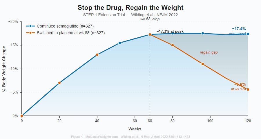 This is not a failure of willpower. The biology predicts it. In the STEP 1 extension study, participants who stopped semaglutide after 68 weeks regained roughly two-thirds of their lost weight within a year.19 In the STEP 4 withdrawal trial, patients who stopped at week 20 gained back nearly 7% of their body weight over the next 48 weeks, while those who continued the drug kept losing.20
