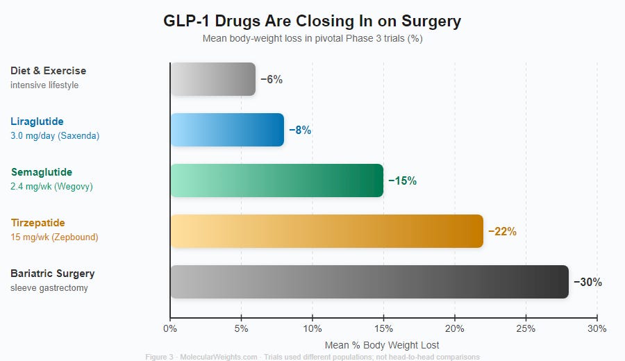 Figure 3. GLP-1 Drugs Are Closing In on Surgery. Mean body-weight loss from each drug’s pivotal Phase 3 trial (SCALE for liraglutide 3.0 mg; STEP 1 for semaglutide 2.4 mg; SURMOUNT-1 for tirzepatide 15 mg). Bariatric sleeve gastrectomy shown as surgical benchmark. Trials used different populations and follow-up lengths; not head-to-head comparisons.