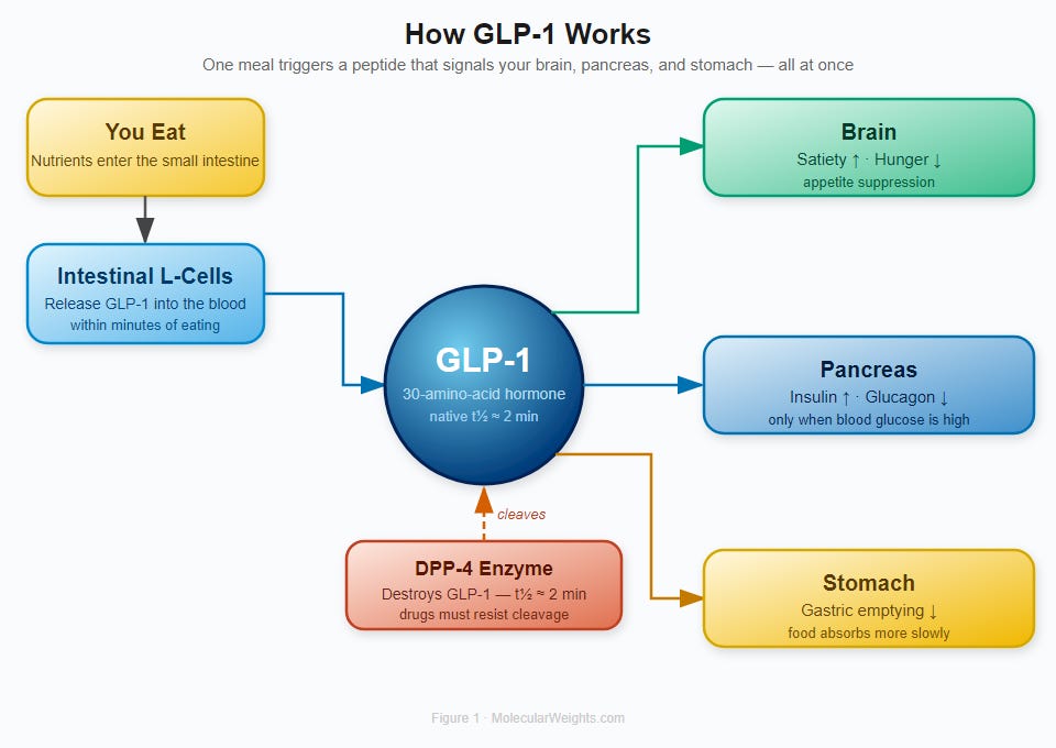 Figure 1. GLP-1 Signaling Cascade. After a meal, nutrients in the small intestine trigger L-cells to release GLP-1 into the bloodstream. The hormone acts simultaneously on the brain (satiety), pancreas (insulin release, glucagon suppression), and stomach (slowed emptying). DPP-4 enzyme cleaves GLP-1 with a half-life of approximately 2 minutes, which is why early drug development focused on DPP-4 inhibitors and on engineering longer-lived GLP-1 analogs.